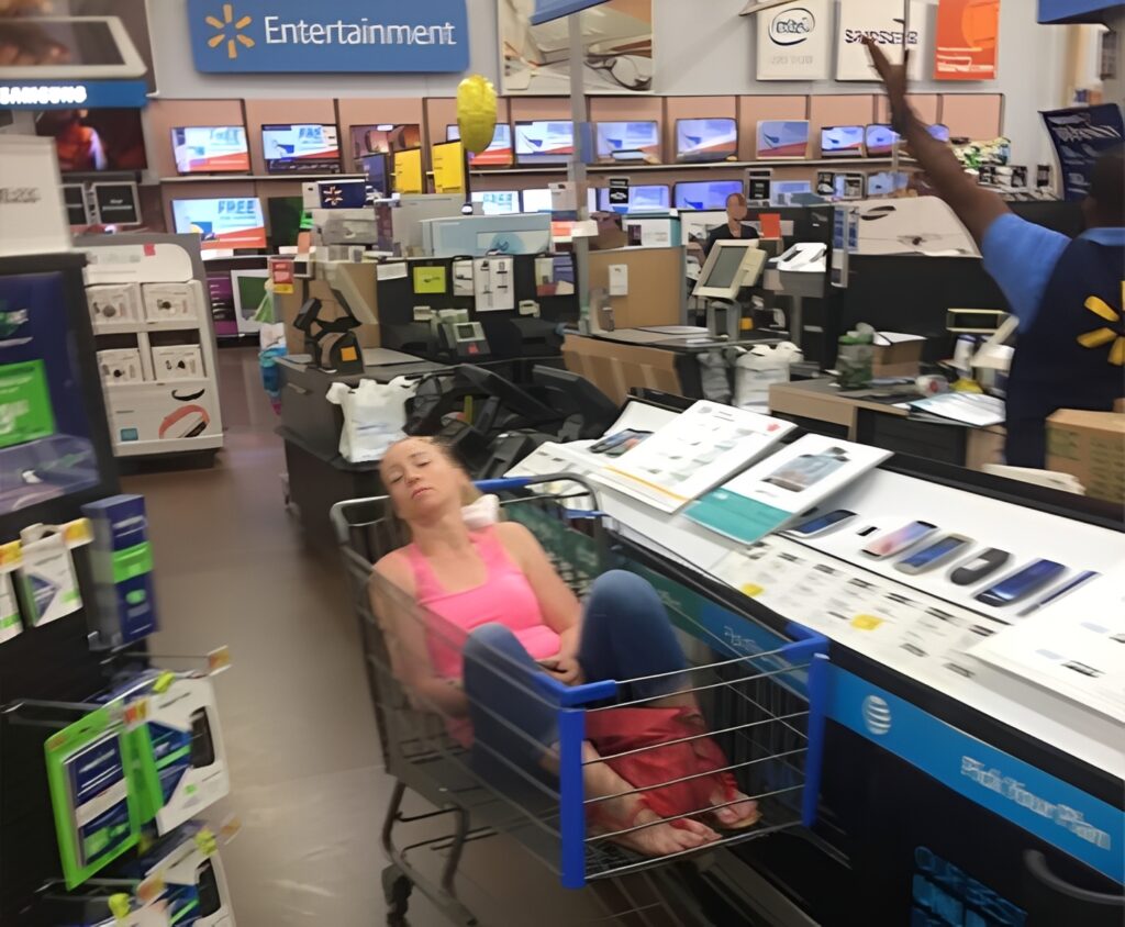 Walking through the store is clearly overrated. This customer decided that walking is for mere mortals and turned the grocery cart into her personal chariot. Why use your legs when you can comfortably curl up inside the basket like the most valuable item in the store?