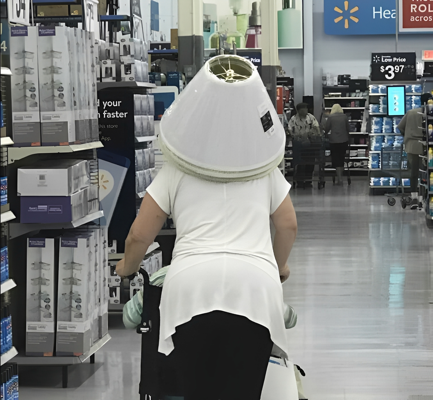 Who says you absolutely need a shopping cart? This woman proves that necessity is the mother of invention: when your hands are busy pushing a wheelchair but you urgently need a lampshade, you have to get creative.